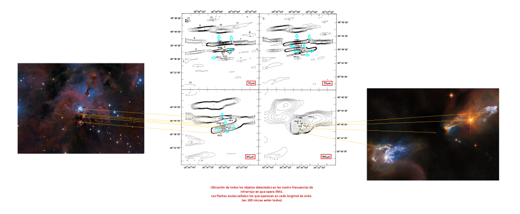 Esta misma disposición de las fuentes detectadas se puede ver a continuación con los datos proporcionados por IRAS en cuatro bandas de infrarrojo (Pravdo y Chester, 1987).