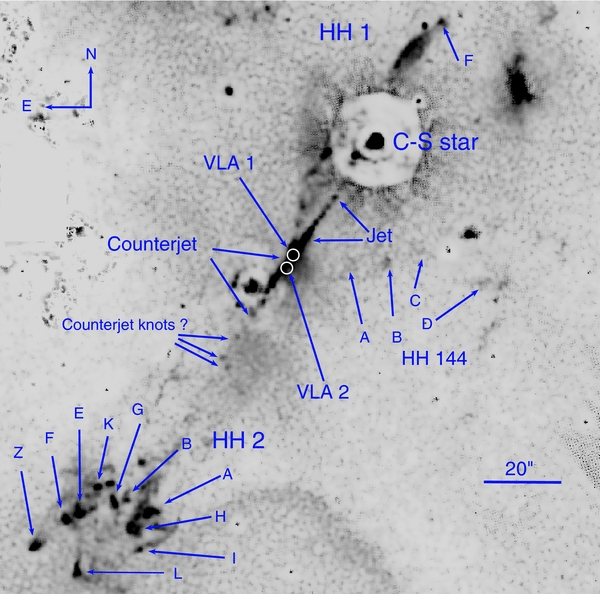 Venía a complicarlo un poco más el descubrimiento de un nuevo flujo que parecía originarse en la fuente VLA 2. Un chorro que se bifurcaba y que hacía presagiar la presencia de una binaria muy joven que produciría los flujos de los objetos HH 144 y HH 145 (Reipurth et al., 1993).