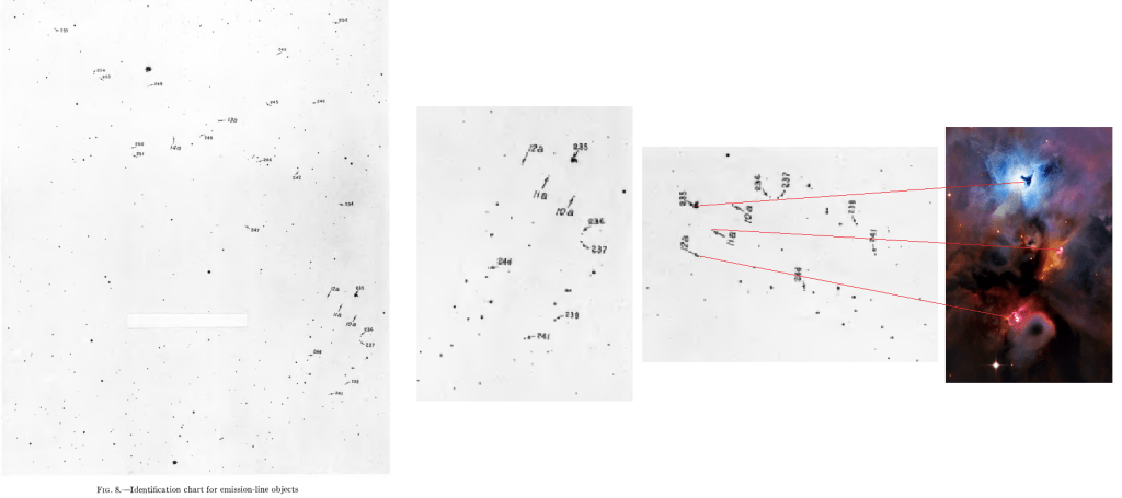 Nuevamente aparecerán estos dos objetos en un artículo posterior en el que se destacaban algunos objetos peculiares en Orion (Haro, 1953). Aquí el mapa de Haro donde les asigna los números 11a y 12a para el núm. 1 y núm. 2 de Herbig