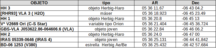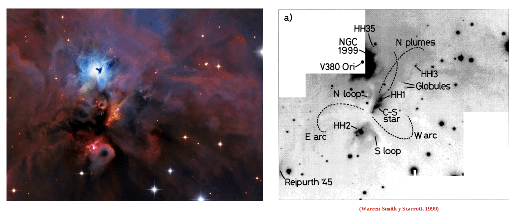 También distinguieron una nebulosa, a la que llamaron X, que aparecía en uno de los nudos del chorro HH 1 donde parecía desviarse otro flujo, casi paralelo.