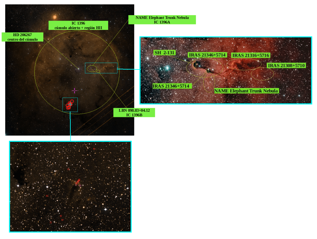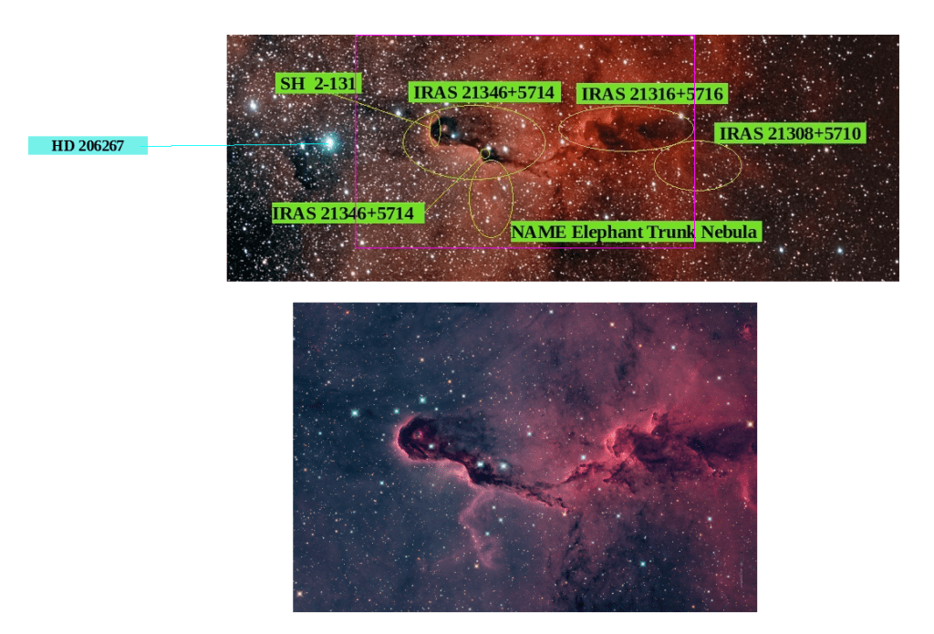 He de volver a la entrada ‘Semillero de planetas’ y a la foto comparativa que citaba antes. Como se puede comprobar en el fragmento de la foto, en aquella ocasión se resaltaba una pequeña zona alrededor del centro de coordenadas de SH2-131. Sin embargo, en el registro del objeto en el CDS, se le adjudican elementos lejanos, todos jóvenes, que podrían hacer pensar que forman parte de IC 1396.