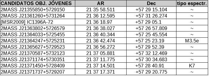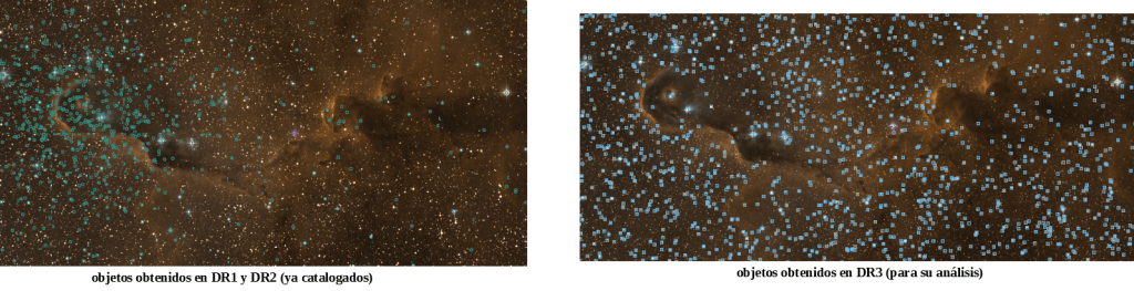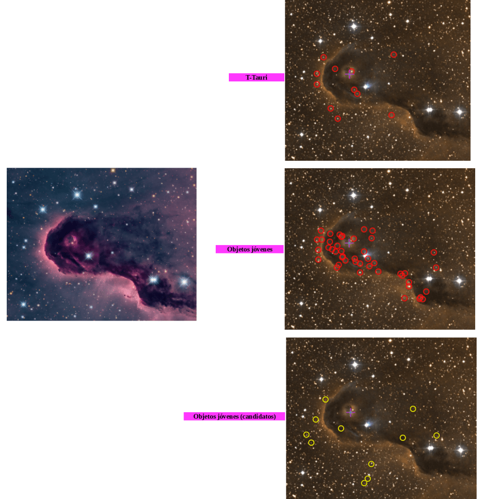 Como resultado de esa búsqueda a distintas longitudes de onda, a continuación se muestran las distribuciones de los distintos tipos de objetos jóvenes detectados. Las imágenes son del DSS2.