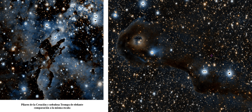 Ya que podemos permitirnos el lujo de ir a un ritmo lento, ¿qué pasaría si comparáramos los tamaños de la nebulosa Trompa de elefante y los Pilares de la Creación en M 16?