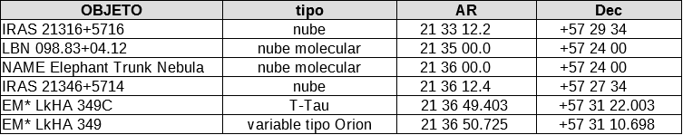 No acabo de comprender el papel del objeto Sharpless SH2-131 que, tanto en la bibliografía como en las dBs consultadas, unas veces parece tratarse del mismo objeto IC 1396 (¿o será IC 1396A?), haciendo referencia a la región HII, y otras como objeto independiente.