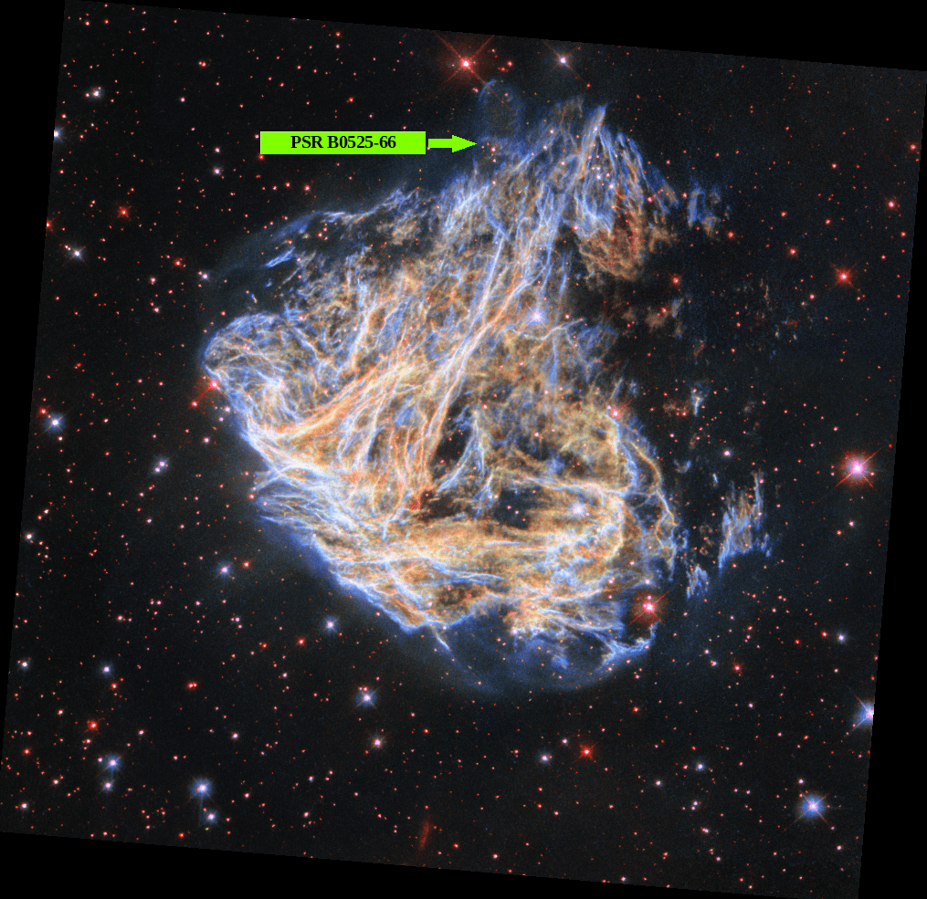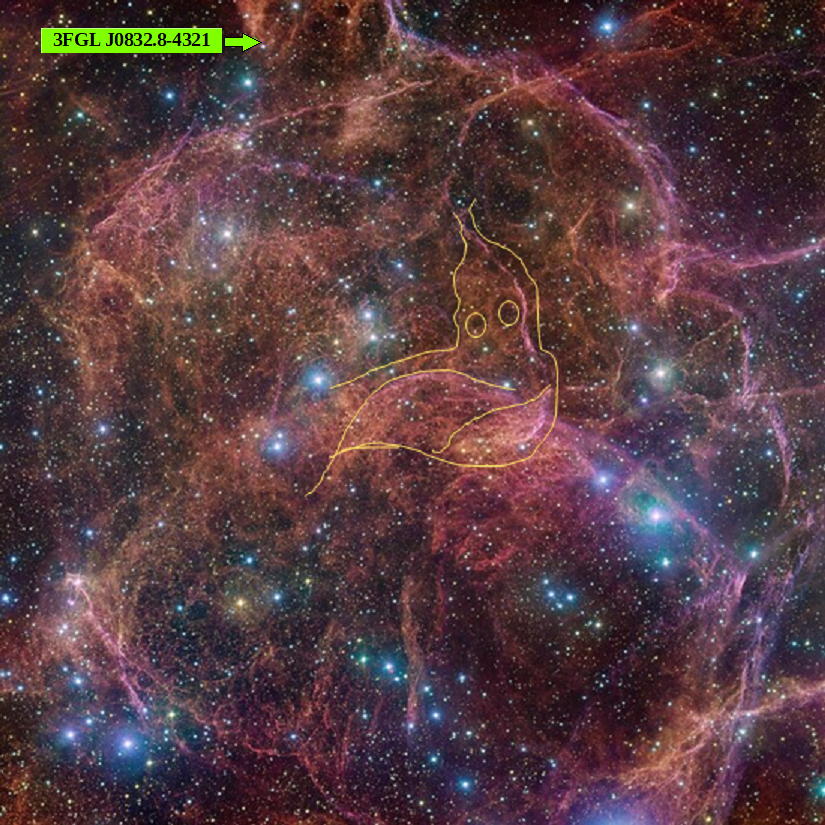 Es posible que el púlsar a qué se refiere el texto sea 3FGL 50832.8-4321, sin embargo no consta como tal en las dBs del CDS, sino que está catalogado como ‘candidato a blazar’. Señalado con la flecha verde