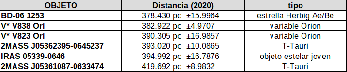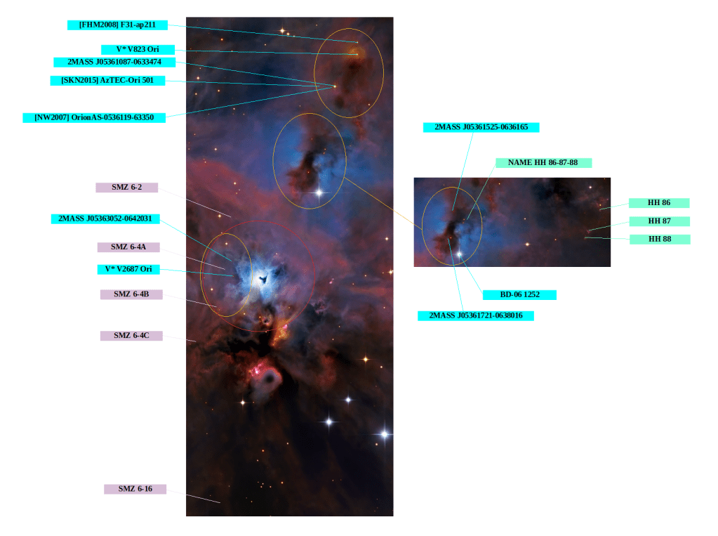 Y más abajo un poco de todo; por ejemplo un candidato a objeto joven [NW2007] OrionAS-0536119-63350 o una fuente de radio [SKN2015] AzTEC-Ori 501.