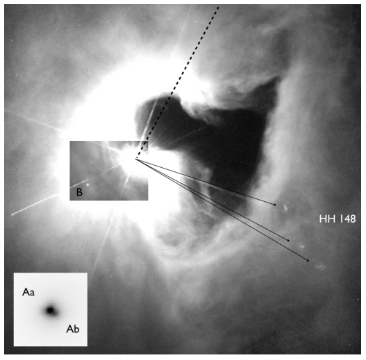 Ya se ha dicho antes, tanta actividad y choques entre discos, gases, etc., sobre todo en BD-06 1253, produce variaciones de ángulo en las salidas de los flujos. Esto es lo que pasaría con HH 148 del que se hablaba en la entrada anterior, muy cercano al sistema múltiple que dejaba constancia de estas variaciones con unos nudos desplazados. No obstante, de momento, todavía no parece que se haya localizado su opuesto bipolar.