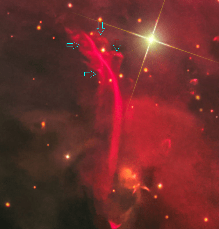 Según los autores (sigo con el mismo artículo), en el mismo evento cataclísmico que se habría producido para la expulsión de la enana marrón V380 Ori B, se habría eyectado el chorro gigante HH 222 que todavía sigue expandiéndose. Las ‘serpentinas’ formarían parte de esa onda de proa.