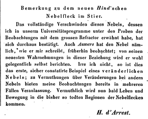 La desaparición completa de esta nebulosa, que mencioné en nuestro programa universitario entre las muestras de las observaciones con el gran refractor, se ha confirmado plenamente. Auwers también ha observado la nebulosa en el pasado, según me escribe; probablemente él mismo informará de vez en cuando sobre sus últimas observaciones al respecto. Si no me equivoco, éste es el primer ejemplo observado de forma fiable de una nebulosa variable; mis observaciones ya han dado lugar a especulaciones sobre cambios en otras nebulosas en varios casos. Es de suponer que la vida y el movimiento llegarán pronto a las regiones hasta ahora muertas de las nebulosas”.