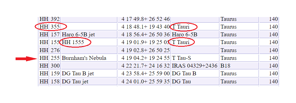 En la siguiente imagen que recoge parte de ese catálogo, están diferenciados HH 255 o nebulosa Burnham y HH 155 que se identifica con HH 1555 (debe querer decir NGC 1555).