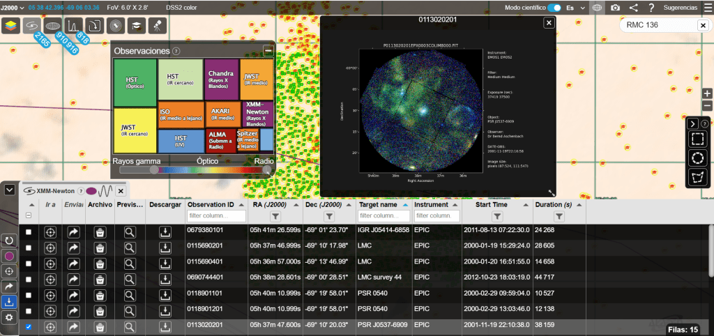 Se trata de una aplicación, ESASky, desarrollada en el ESDC-ESAC S cience Data Centre, justo aquí al lado, en Madrid, desde la que se pueden consultar los distintos archivos proporcionados por las diferentes misiones que, hasta ahora (*), debían consultarse de manera independiente.