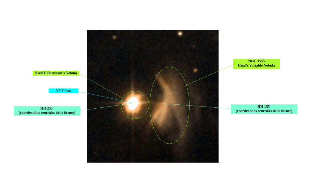 Esto es pura apreciación personal, Burnham sí podría estar describiendo fogonazos (nebulosa variable) alrededor de T Tau. Se podría identificar con las variaciones visuales que generan la eyección de los chorros de los HHs y que, parece, se pueden identificar en periodos breves (en tiempo terrestre). No me queda claro. Tampoco, insisto, si pueden ambos, Hind y Burnham, referirse a la misma nebulosa.
