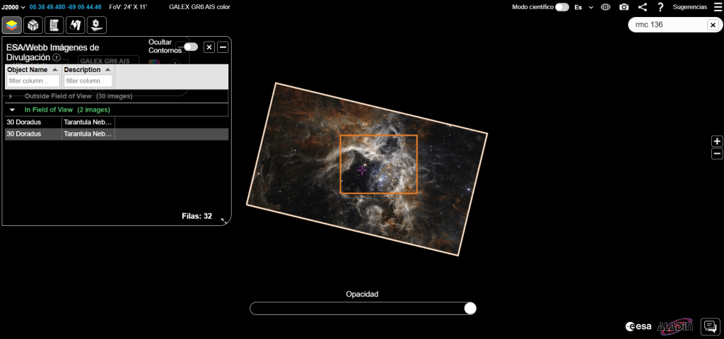 En el modo explorador son escasos los resultados. No existen imágenes tomadas por el Hubble o por el JWST. Mediante la opción ‘elección de cielos’ sí permite verlas en función de la longitud de onda deseada.