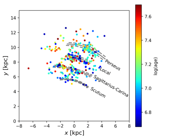 En la siguiente imagen extraída del artículo se sitúan, en el plano galáctico, los cúmulos con edad inferior a 50 millones de años de los 1750 cúmulos abiertos analizados (el centro de la galaxia es el punto (0,0), el sol está señalado con una cruz roja en el brazo Local, punto (0,8.5).