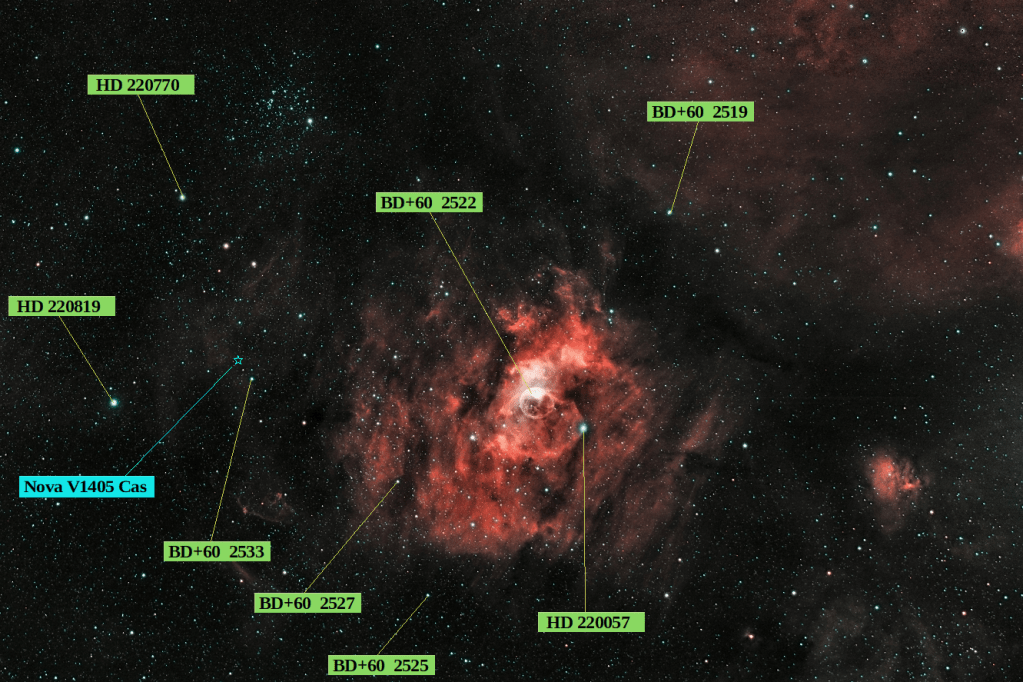 Siendo tan reciente, hay que recordar la explosión de la nova, V1405 Cas, registrada el 18 de marzo pasado por el astrónomo amateur Yuji Nakamura (azul en la imagen inicial).