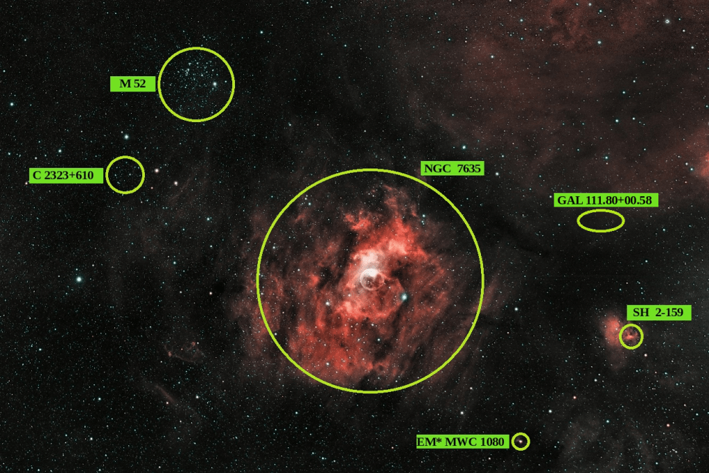Destaca en la parte central de la fotografía. Es una región HII ionizada descubierta por William Herschel el 3 de noviembre de 1787 y sabemos que anotó, habiéndola observado 2 veces, que se trataba de una estrella en Cassiopeia, seguida de una nebulosa de 2’ de largo por 1,5’ de ancho, con un ‘precioso brillo en el medio’. Ocupaba el número 706 de su catálogo publicado en 1789. Él no podía distinguir la burbuja y es fácil suponer que ahora estaría maravillado al verla.