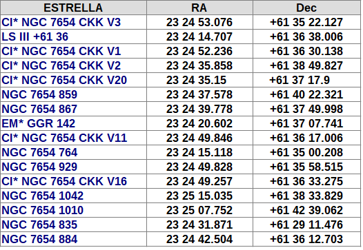Respecto a M52 hay que hacer notar la importante población de estrellas variables pulsantes todavía no clasificadas.