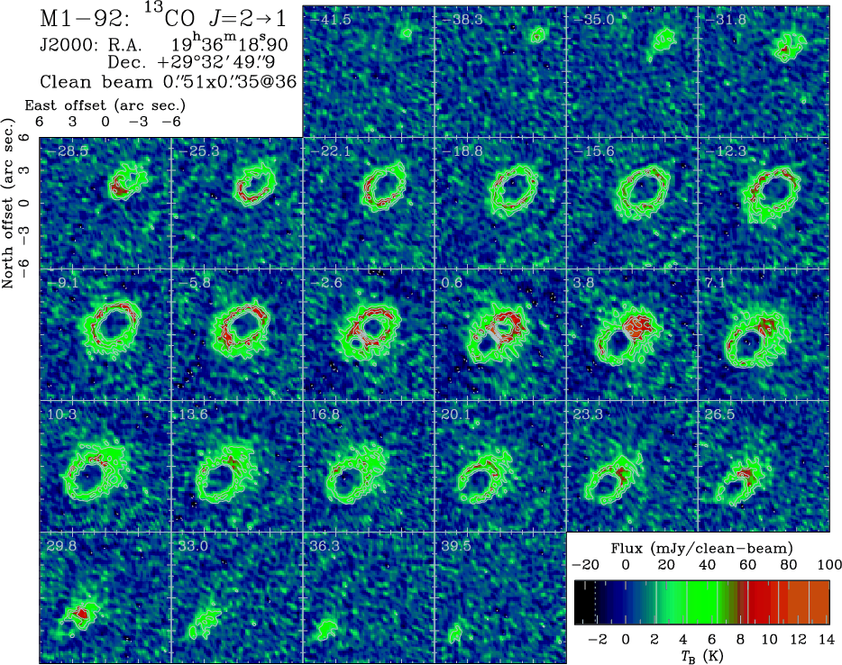En la siguiente imagen se puede identificar la estructura de la nebulosa a través del estudio de la presencia de 13CO. Se puede identificar la evolución del flujo de gas más caliente (en rojo)