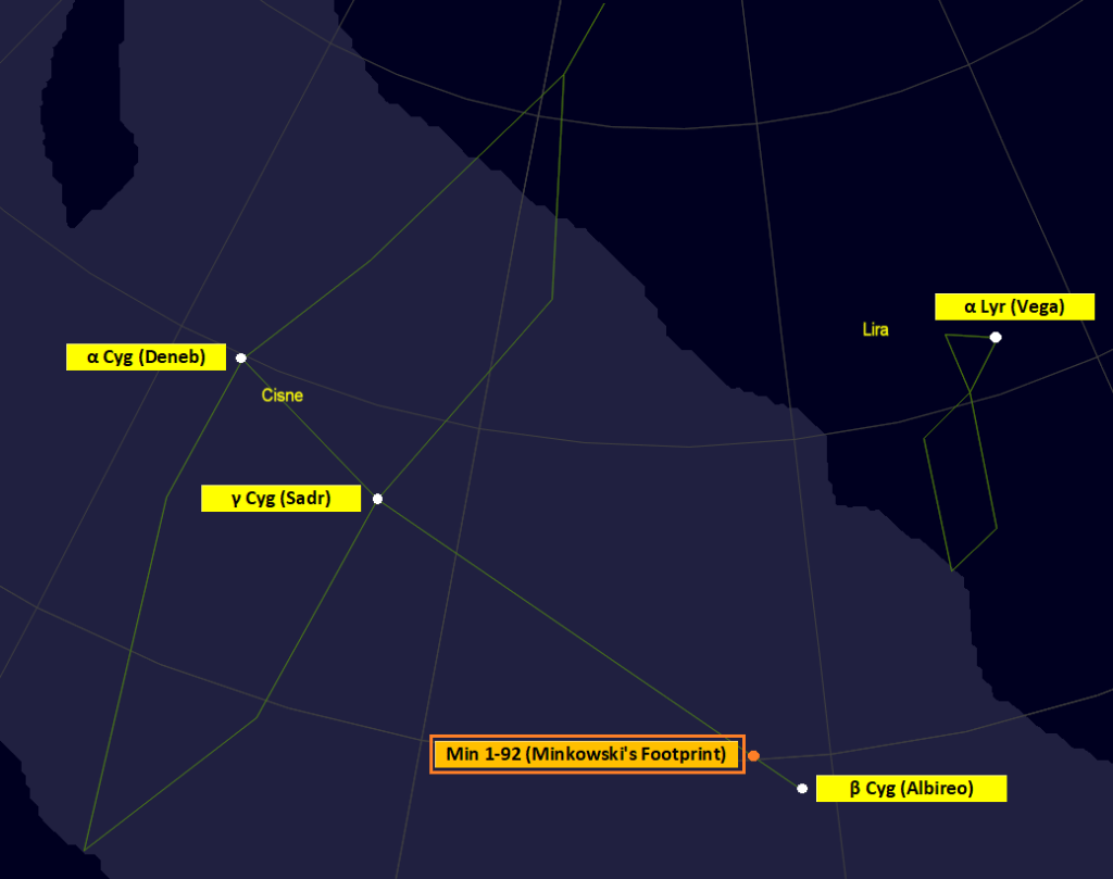 Este será su segundo nombre Footprint Nebula o Minkowski’s Footprint, en honor a su descubridor (Minkowski, 1946), aunque la forma normalizada es Min 1-92.