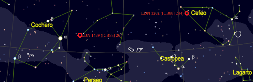 ¡Bueeeno! Aquí (me) parece que hay algo de lío (otro). Diferentes catálogos de nubes moleculares y nebulosas oscuras en una misma zona: ¿concurrencia? ¿disparidad? ¿superposición?