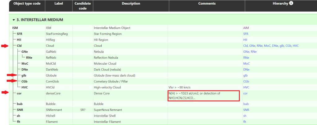 Existen otros dos objetos conceptualmente próximos que son glb-Globule (low-mass dark cloud) y Cgb-Cometary Globule/Pillar. Ambos se incluyen como subapartado de objeto Cld-Cloud, ¿qué razones hay para no incluir los núcleos densos?