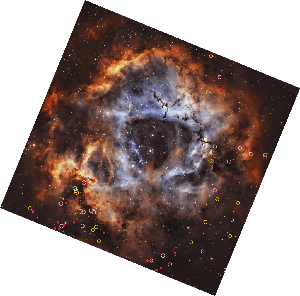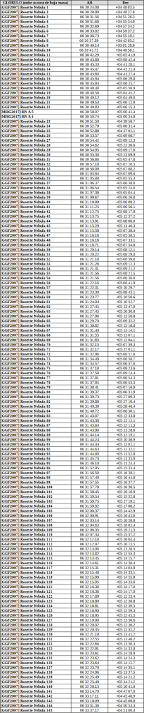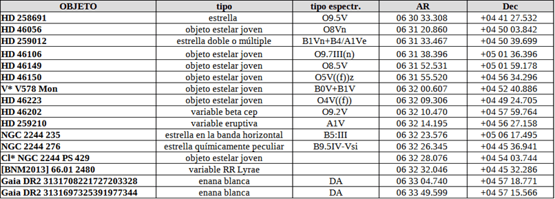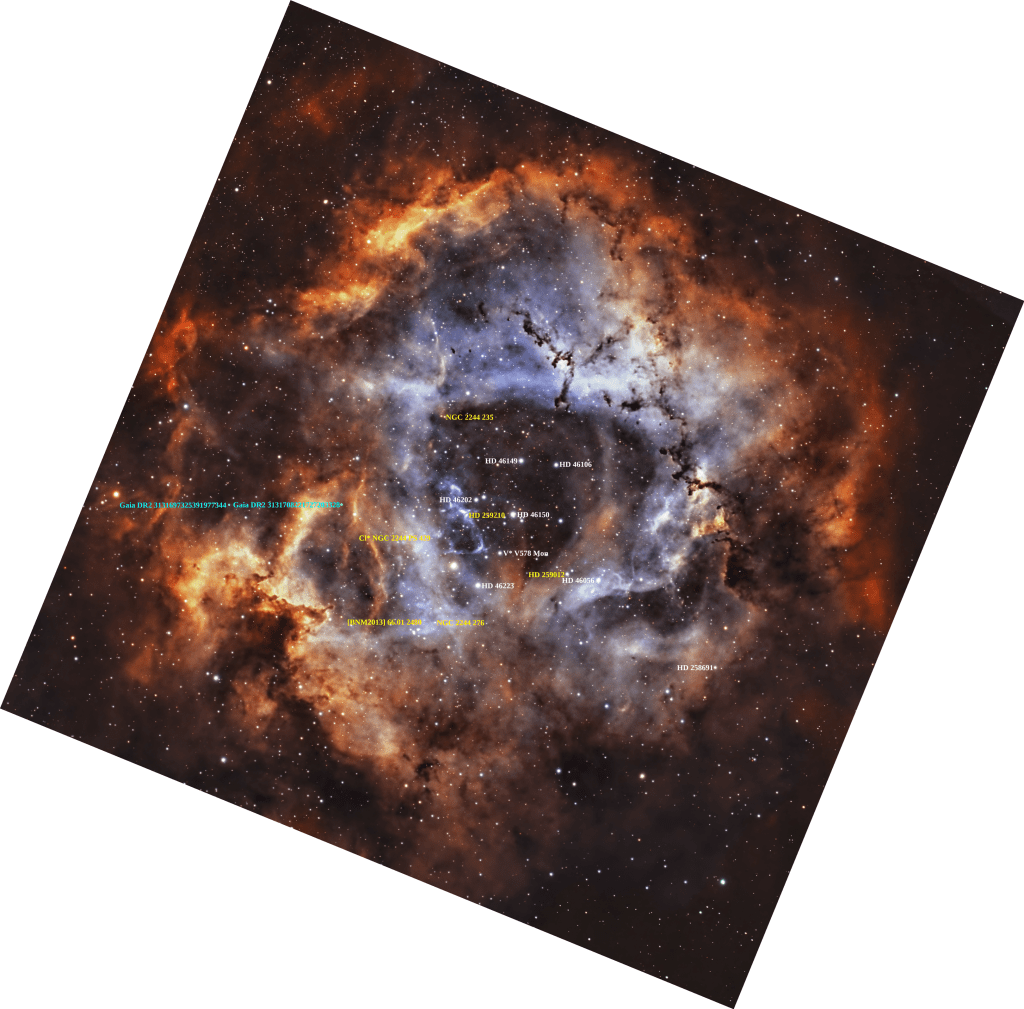 Por último está Cl* NGC 2244 PS 429 que viene a hundirme más en la desesperación. La susodicha resulta que pertenece a la NAME Rosette Nebula, a la NAME Rosette Molecular Cloud y al cúmulo NGC 2244 … ¿por qué ella sí y el resto no? … a ver ¿por qué?