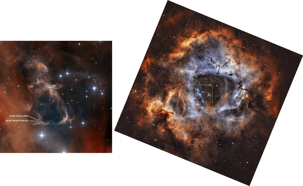 Justo por la misma zona aparecen otras áreas catalogadas como regiones HII y una ya no sabe si se trata de la misma identificada en distintos sondeos o no; pero aparecen como objetos distintos en la bd Simbad … desesperación. Tampoco la bibliografía parece separarlas, ni asegura que no formen parte de Rosette … más desesperación.