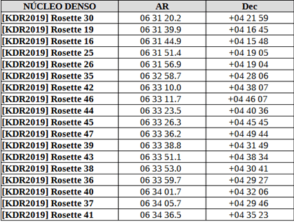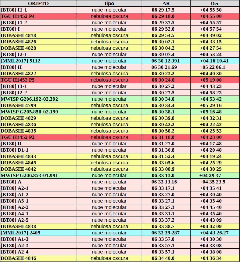El otro catálogo de nebulosas oscuras que aparece en la tabla fue realizado por Kazuhito Dobashi, el mismo que había encabezado el estudio anterior; esta vez con datos de infrarrojo de 2MASS-Two Micron All Sky Survey (Dobashi, 2011). ¿Qué criterio hace que, unas sí y otras no, sean aceptadas como partes de la nube molecular Rosette? ¿estudio químico?