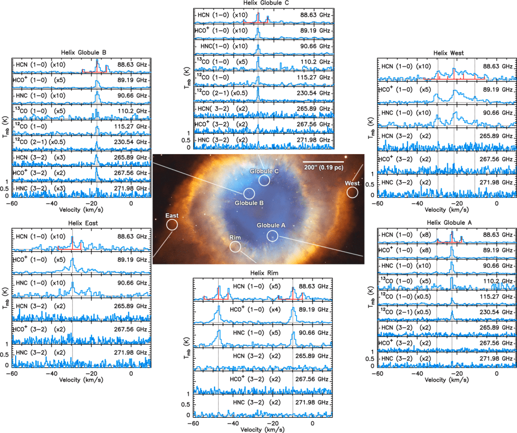 Estas dos moléculas varían según las distintas formas y edades de las nebulosas planetarias. Parece que la Helix y sus glóbulos ayudan a determinar cómo varía esa relación (Bublitz et al., 2020).