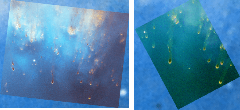Entre esos glóbulos irradiados por la estrella central se dan zonas tanto de ionización como de disociación y el estudio de ambas van proporcionando claves sobre los cambios que se van realizando en el medio interestelar que rodea la estrella a medida que se expanden sus capas.