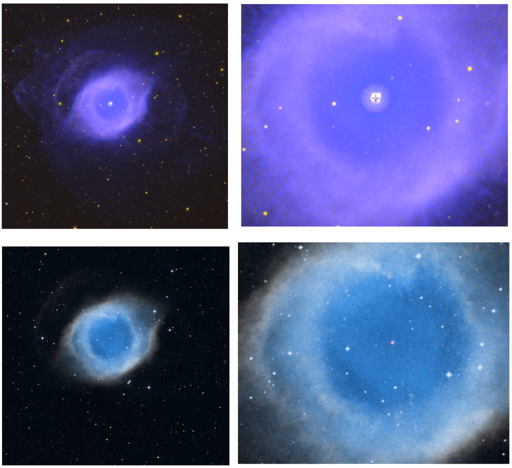 NGC 7293 es la número 287 entre las indudablemente azules. El método utilizado es comparar tres imágenes tomadas en azul, amarillo y ultravioleta para superponerlas desplazándolas levemente y poder así compararlas (Haro y Luyten, 1962).