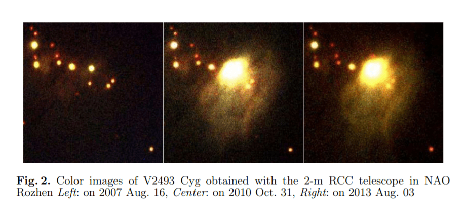 Otro caso intrigante (como diría Kuhn). Nos encontramos con una variable de tipo FU Orión (eruptiva) cuya explosión fue detectada en 2010 (Semkov et al., 2014) y que se prolongaría en el tiempo tal y como muestra la imagen