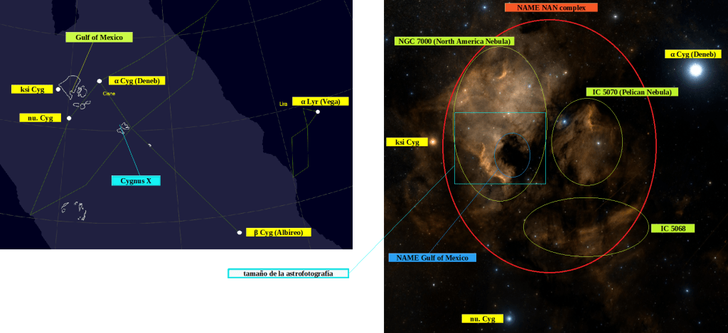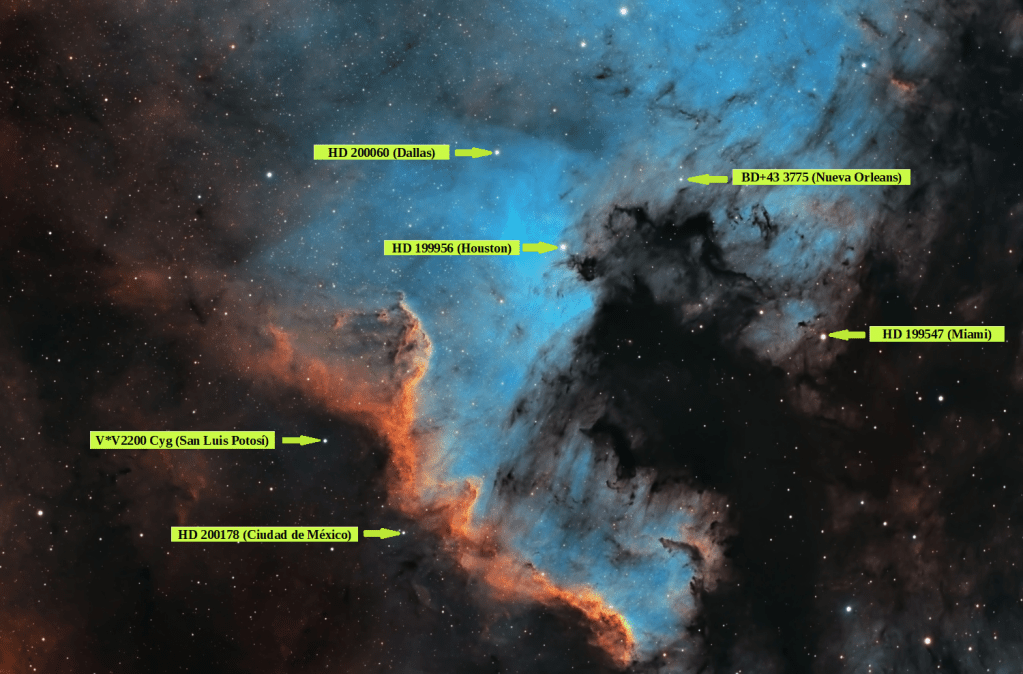 Con las indicaciones del mapa de los USA, podríamos decir que el centro de NGC 7000 (NAN) se halla a la altura de Dallas, que más abajo, el punto luminoso junto al mar oscuro, sería Houston. A su derecha, la desembocadura del río Misisipi con su idéntica marea negra, muerta. Imposible para la vida, solo Nueva Orleans parece resistir … Miami ya es otra cosa… y también Ciudad de México o San Luis Potosí.