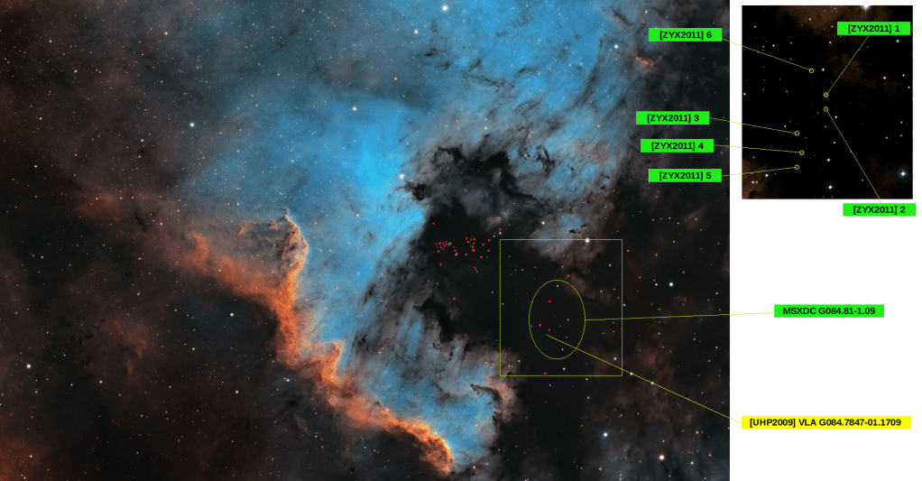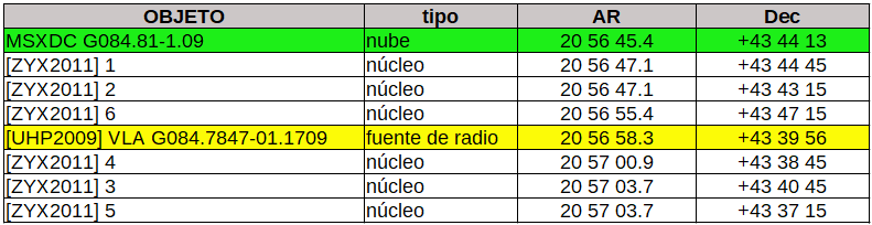 Decididamente, con gafas especiales, podríamos localizar la nube molecular MSXDC G084.81-1.09, donde se identificarían algunos núcleos invisibles en la astrofotografía. Superman sí podría ver la fuente de radio de nombre mareante [UHP2009] VLA G084.7847-01.1709.