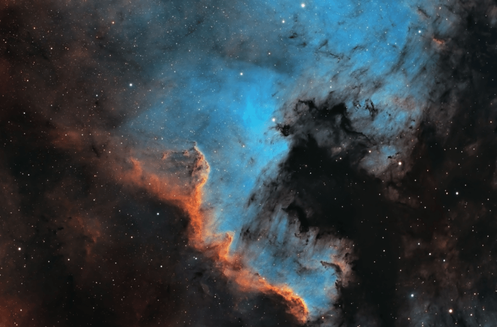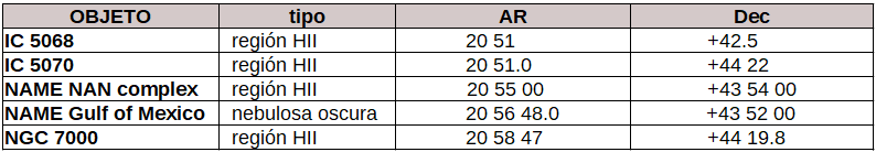 A las nubes densas que se crean en los nidos protoestelares hemos de sumar la nube que se interpone en la línea de visión. Así definía la zona George Horward Herbig en 1958: ‘Las fotografías directas dan la impresión de que NGC 7000 es sólo el fragmento visible más brillante y mayor de una masa mucho mayor de nebulosidad de emisión que se encuentra detrás de un fuerte oscurecimiento del primer plano’ (citando a Morgan, Strömgren y Johnson).