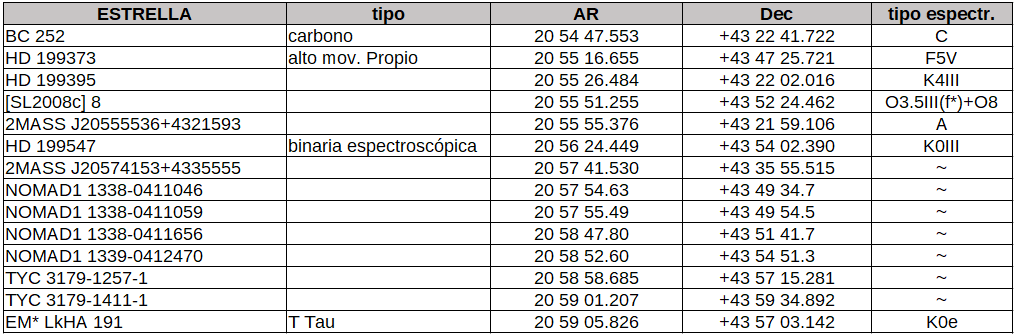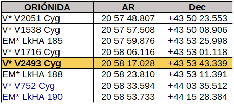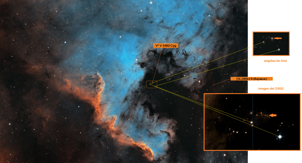Seguro que podríamos encontrar más, pero se destacarán dos: [SL2008c] 8 y V* V 2493 Cyg que, escrito así, no dice mucho pero si acercamos el zoom …