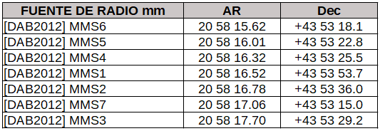 • un conjunto de fuentes de radio en un área muy próxima (en rojo)