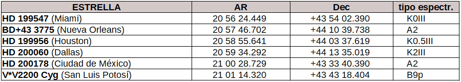 Cruzada la valla del río Bravo sin más alternativa que la pértiga en lugar de la barca, si habláramos de realidad, ya en terreno de los USA, nos dirigimos a Dallas, HD 200060, una siempre atrayente gigante roja que se encuentra a unos 200 pc de distancia que rivaliza con otra gigante roja del territorio tejano, HD 199956 (Houston), casi a la misma distancia, unos 225 pc.