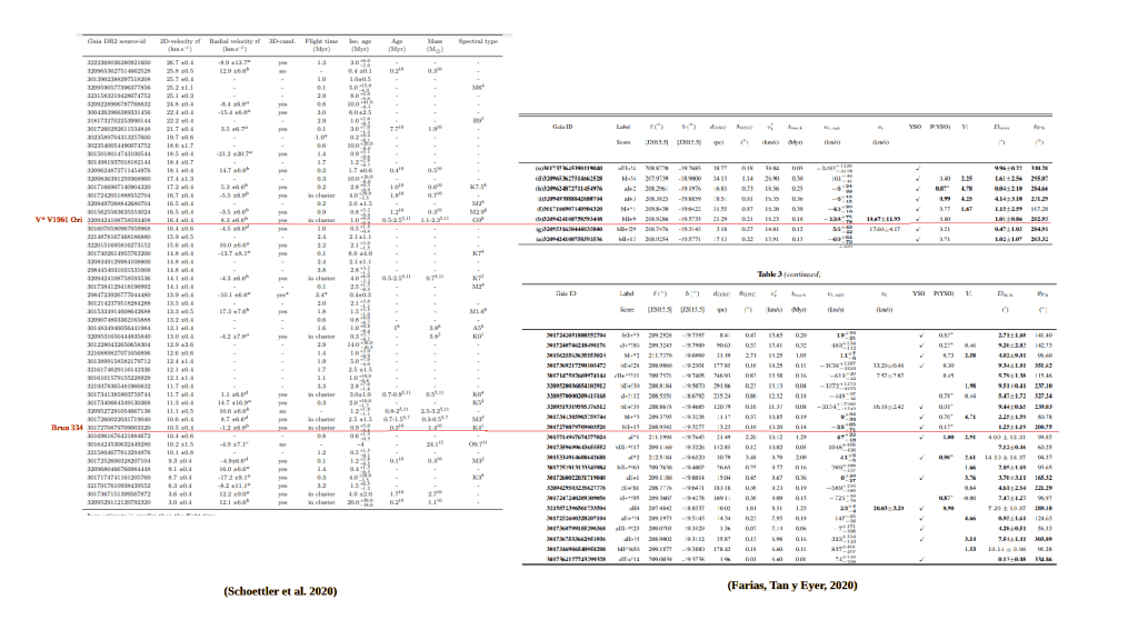 Por aquello de tener más pistas sobre qué tipos de datos se buscan para determinar cuándo se trata de una estrella fugitiva, me he encontrado otro artículo en el que, además de los movimientos detectados en el plano, se buscan otro tipo de características como: tratarse de objetos jóvenes (por su color, magnitud, exceso de IR), tener una gran variabilidad óptica, que sus direcciones de eyección no se puedan confundir con la zona de corriente galáctica principal, que tengan una velocidad radial compatible en 3D y cosas más complicadas para mí, como las distancias de máxima aproximación dentro del radio de media masa del cúmulo (¿distancia al centro establecido para el cúmulo?). En ambos casos, los de nuestras candidatas, se concluye que se trata de objetos jóvenes (Farias, Tan y Eyer, 2020).