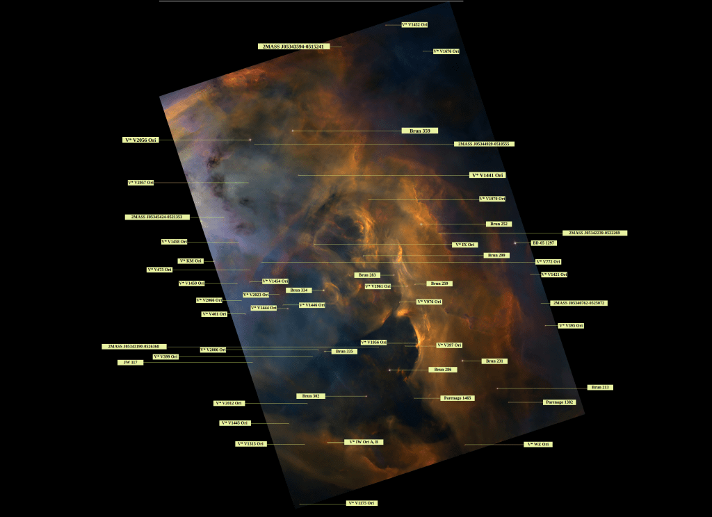 Todas las estrellas de nuestra imagen, excepto V* V395 Ori, Brun 231, 2MASS J05342239-0522269, Brun 252 y V* IW Ori, formaron parte del sondeo aunque, de nuestro grupo solo V* V1961 Ori y Brun 334 se postularon como candidatas.