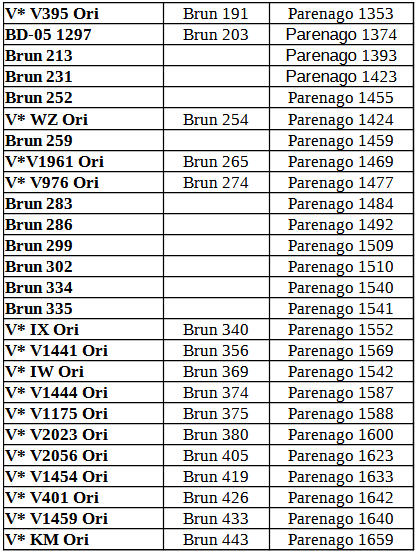 Todas estas estrellas de nuestra imagen conservan la denominación Brun, si no en el nombre oficial, entre los alternativos aceptados. Y estos son sus equivalentes Parenago: