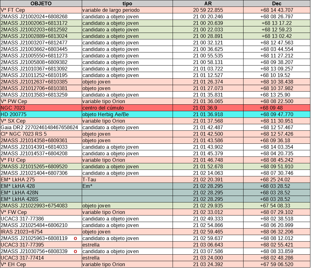 Se trata de un objeto joven, brillante en el infrarrojo que tiene un punto en común con todos los objetos (candidatos o no) que están recogidos en la primera tabla: se considera integrante de la Llamarada de Cepheus (NAME Cep Flare) en la que habrá que detenerse en otro momento… !demasiadas tentaciones para obviarla!