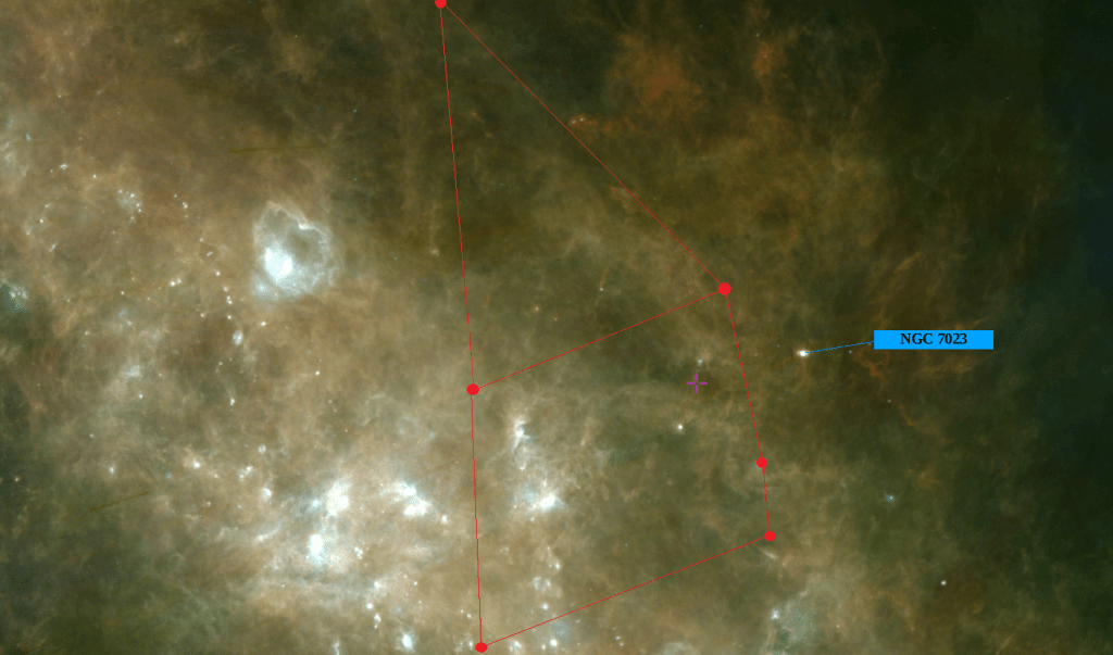 Ya vimos la ubicación de la nebulosa con respecto a Cepheus y entre las demás constelaciones. Y ¿cuál sería la de Cepheus entre el polvo fotografiado por AKARI?. Pues más o menos ésta: