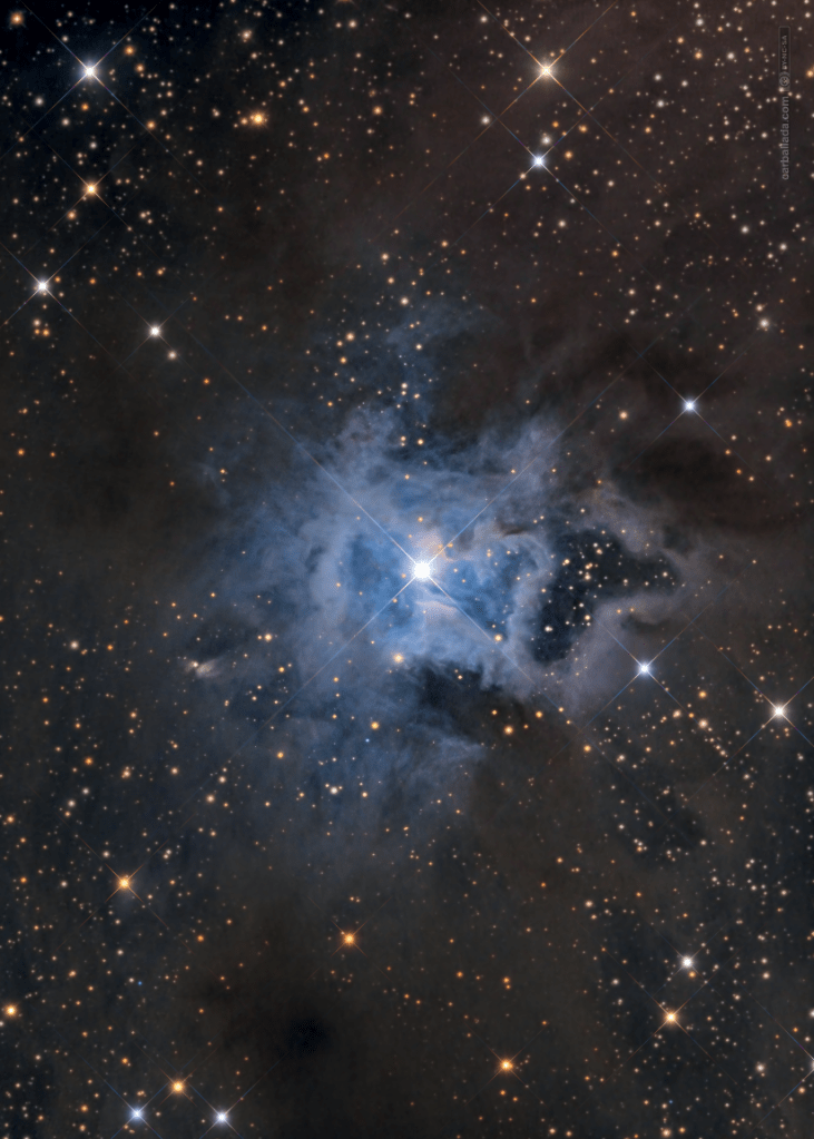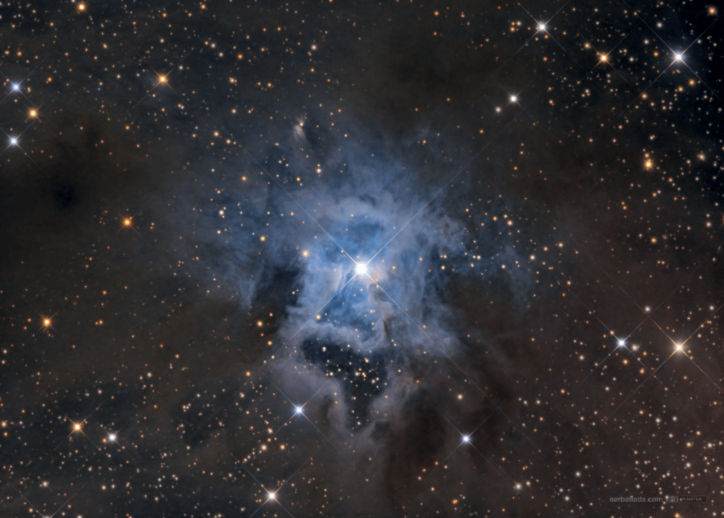 Inevitable citar a Vincent van Gogh, pintor, entre mil cosas, de lirios, estrellas y cielos turbulentos. Desconozco si hay una estrella con su nombre. Quizás esa estrella central de esta nebulosa Iris sería la candidata perfecta.