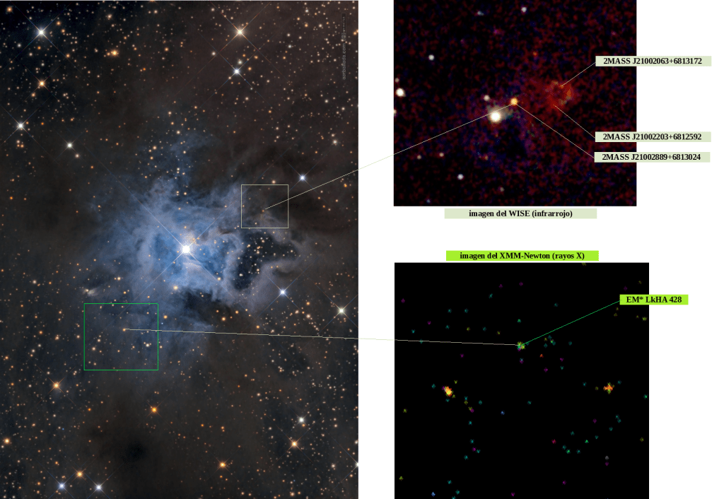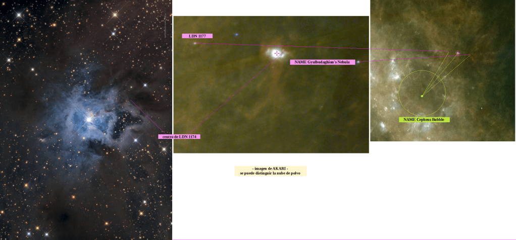 Y también, antes de continuar por este camino hacia fuera, hemos de detenernos en otro ‘punto de luz’. En medio de esa nube oscura está IRAS 21023+6754. Lo podemos encontrar en el sureste de la nebulosa.