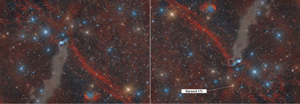 Fotografía de Thomas Lelu [https://en.astrophotographie-lorraine.com]. A la derecha, la fotografía girada donde se resalta el recuadro correspondiente a la imagen anterior. Queda señalada Barnard 175 que volveremos a ver más adelante.