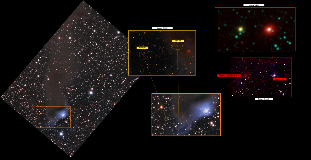 Por otra parte, irresistibles son los dos objetos Herbig-Haro. Aquí imagen en óptico de ambos del SDSS9. Caer en la tentación tiene su premio. Se esperaría algún tipo de semejanza pero llama la atención lo diferentes que se ven.
