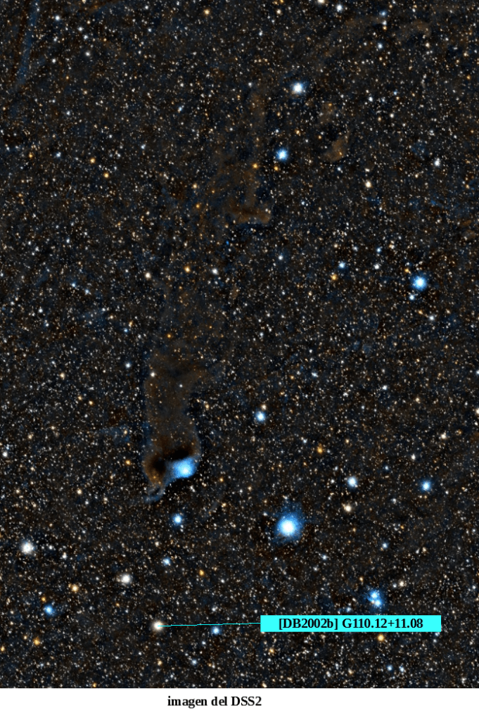Aquí la localización de Barnard 175 o, si se prefiere, [DB2002b] G110.12+11.08, en imagen del DSS2. También se ha señalado en la foto anterior.