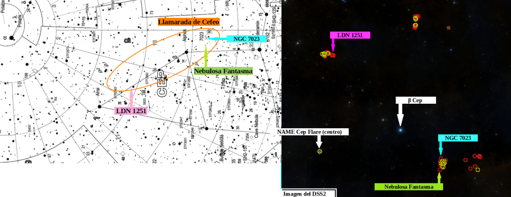 Y, según los elementos que más claramente parecen pertenecer a la llamarada, hay bastante coincidencia. Sin embargo, resulta curioso que la referencia central de NAME Cep Flare [AR 23 34 00.0 Dec +72 00 00] esté alejada de las dos zonas donde se concentran esos elementos (son, principalmente, estrellas jóvenes).