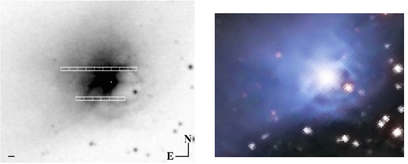 Aún más, según el artículo de Uma P. Vijh, en las retículas de la imagen de la izquierda se muestran los lugares donde calcularon los espectros seleccionados para el sondeo base del artículo. En la retícula norte, la más larga, se muestran los resultados de los espectros obtenidos y parecen compatibles con una onda de choque que, en las fotografías, estaría situada en el norte y nordeste de la estrella (yo no sé encontrarla).